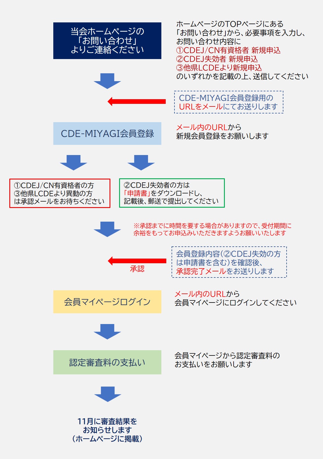 お早めにCDE-MIYAGI会員登録(CDEJ失効の方は申請書の提出を含む)いただき、承認完了メールを受け取り後、認定審査料のお支払いをお願いいたします